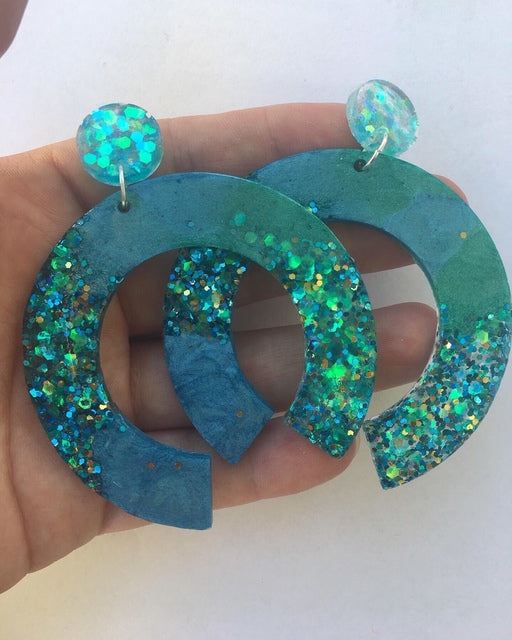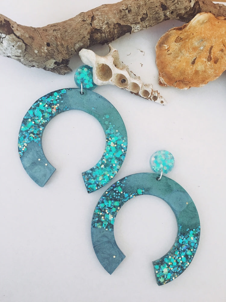 A collection of mermaid and ocean themed earrings made with iridescent glitter and pigment, check out my beach vibes collection for similar products.