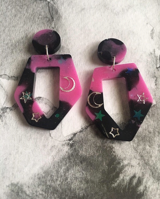 MEDIUM SIZE GALAXY EARRINGS WITH MOONS AND STARS IN A MAGENTA AND BLACK, TRENDY AND CLASSIC.