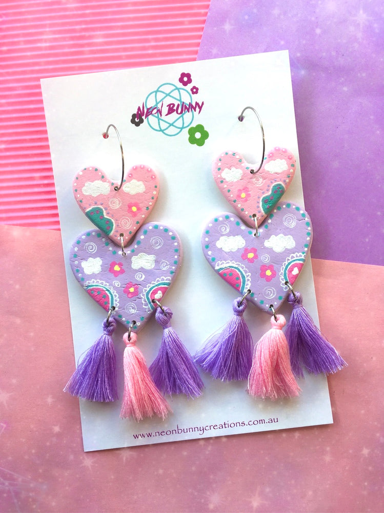 Hand painted clay with mixed tassels and surgical steel hoops! Very light on the ears!