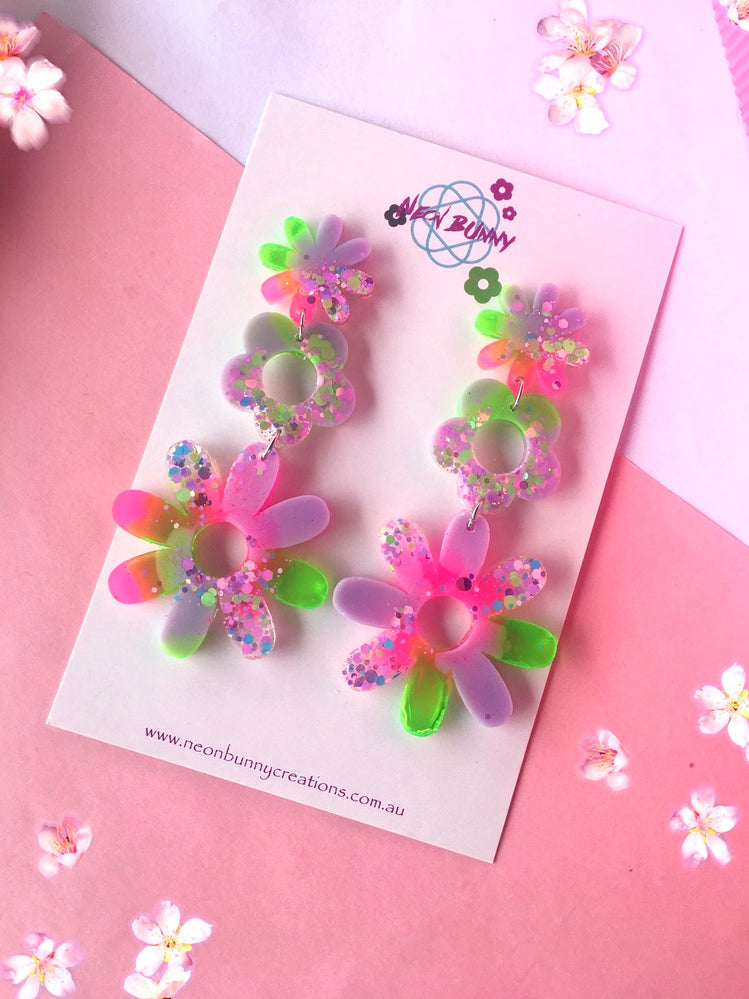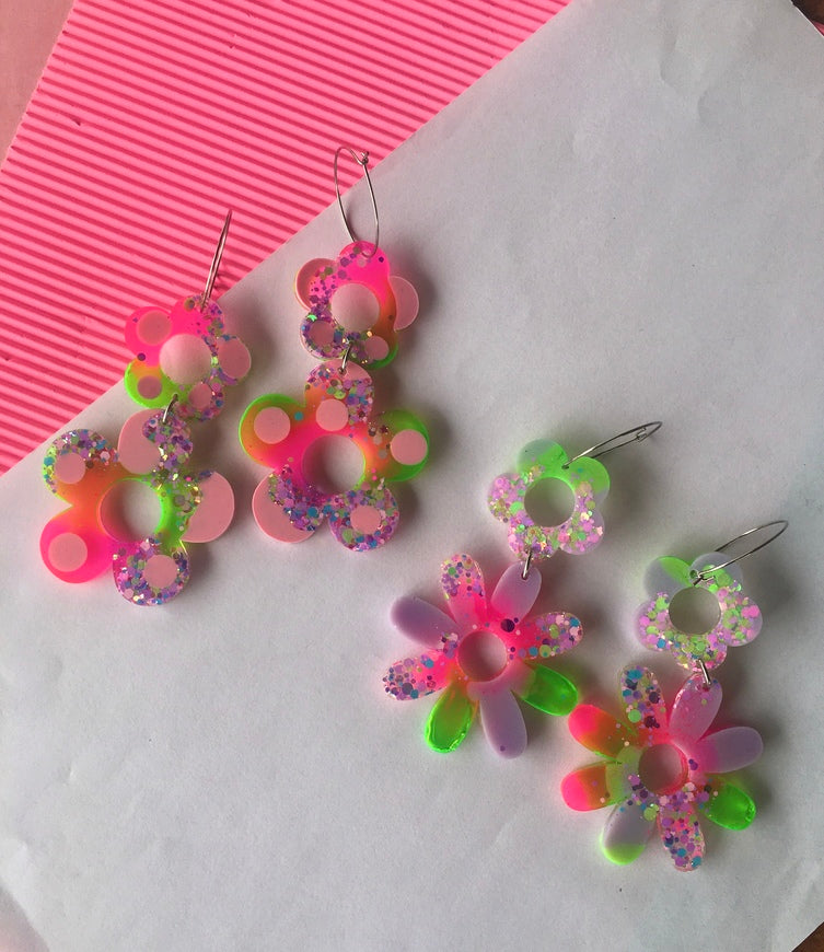 Available in 2 different colour choices with your choice of studs or hoops! This listing is for the 3 piece drop style in pink and purple!