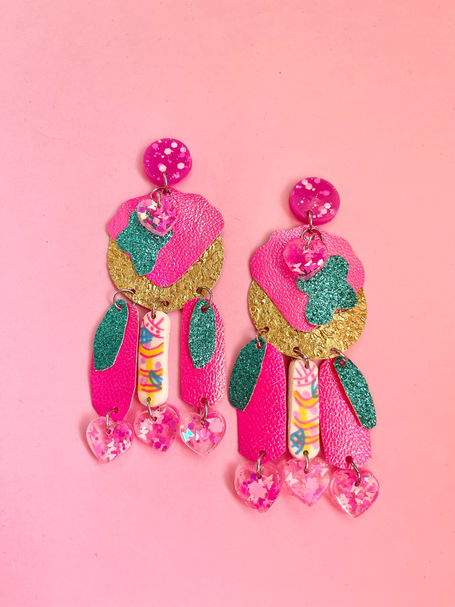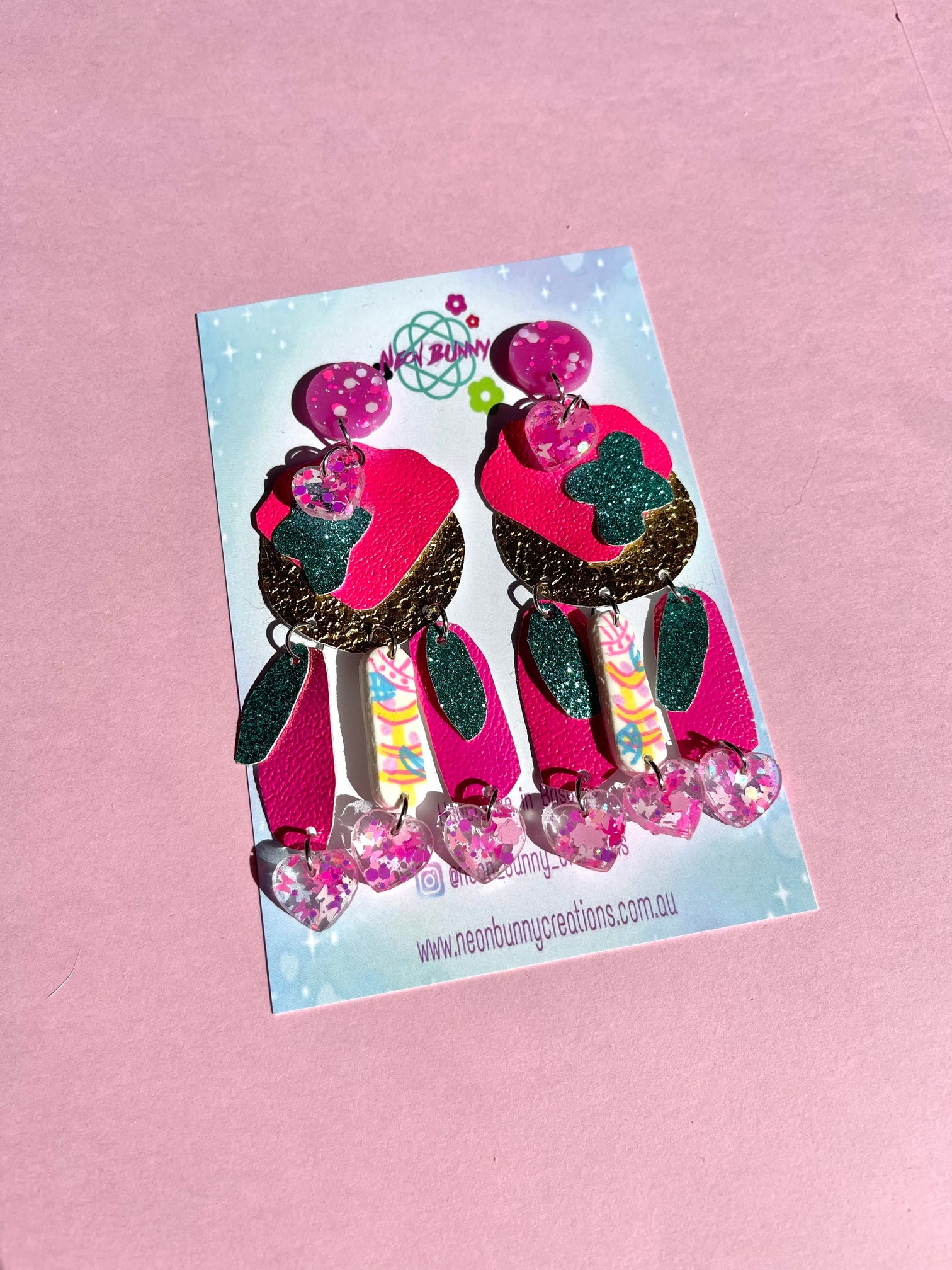 Handmade using faux leather fabric, clay and resin pieces. These earrings are lightweight and have a acrylic felt backing for extra strength.