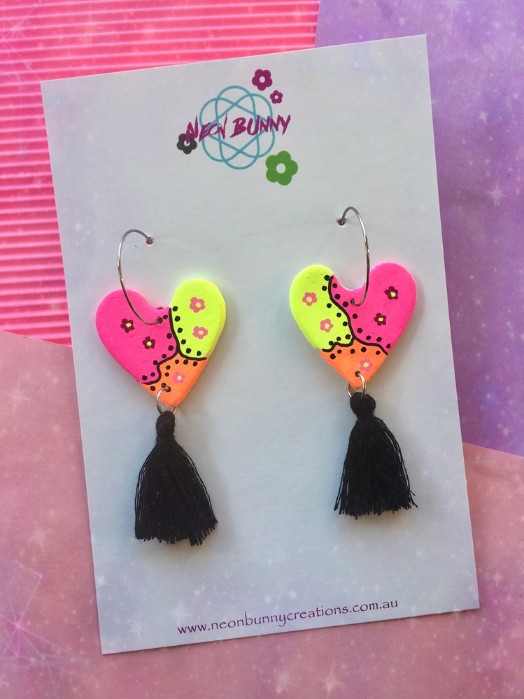 Hand painted clay with mixed tassels and surgical steel hoops! Very light on the ears!
